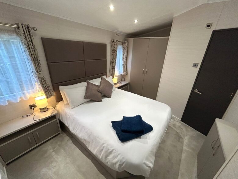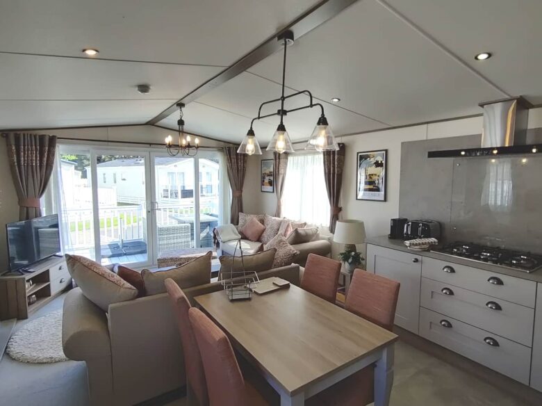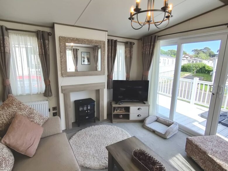 A spacious 2-Bedroom, 2-Bathroom luxury lodge at Hoburne Holiday Park, offering open-plan living, elevated decking with sunset views and a high-end setting for a relaxing getaway.